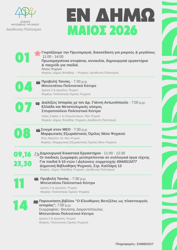 Τον Απρίλιο ο Δήμος Φιλοθέης - Ψυχικού φιλοξενεί ένα πλούσιο πρόγραμμα πολιτιστικών εκδηλώσεων και δράσεων…