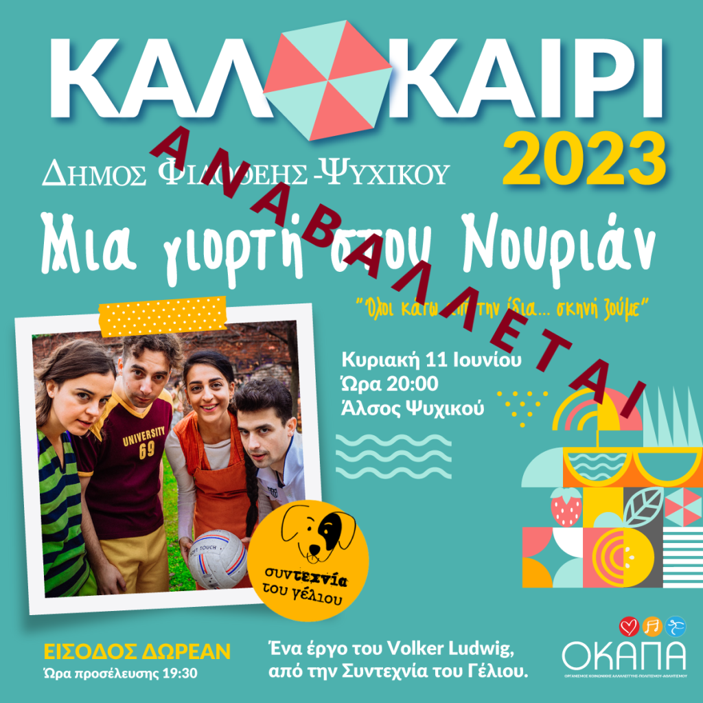 Αναβάλλεται λόγω καιρικών συνθηκών η σημερινή παιδική παράσταση «Μια γιορτή στου Νουριάν» στο Άλσος Ψυχικού. Σύντομα θα ανακοινωθεί νέα ημερομηνία.