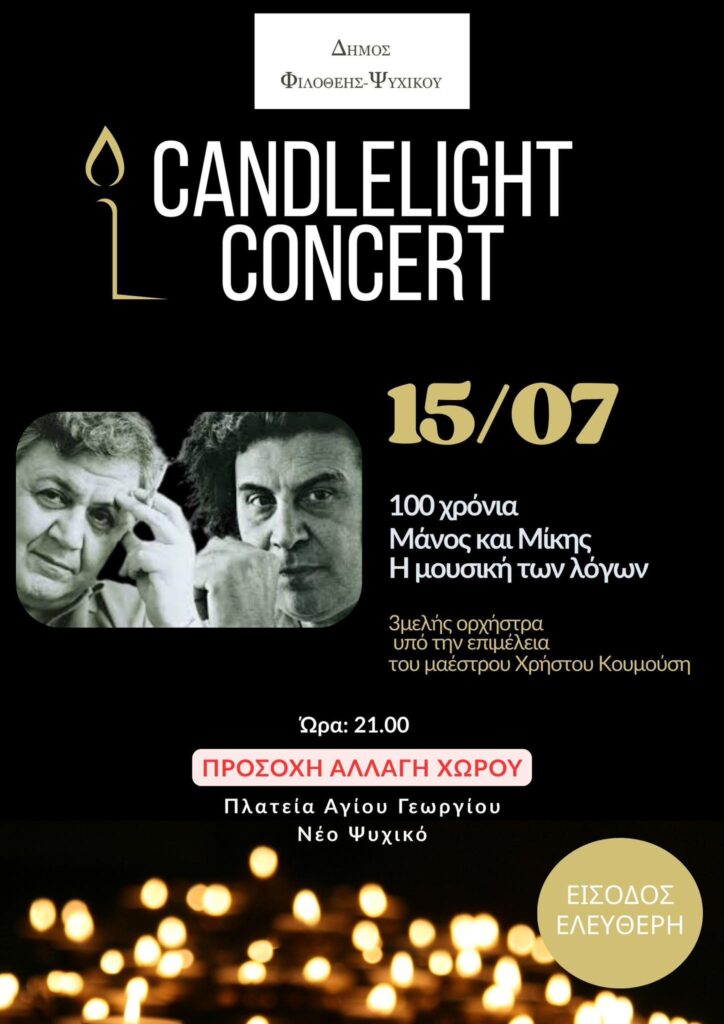 Αλλαγή τοποθεσίας για την αυριανή εκδήλωση Candlelight Concert: 100 Χρόνια Μάνος και Μίκης “Η Μουσική των λόγων”