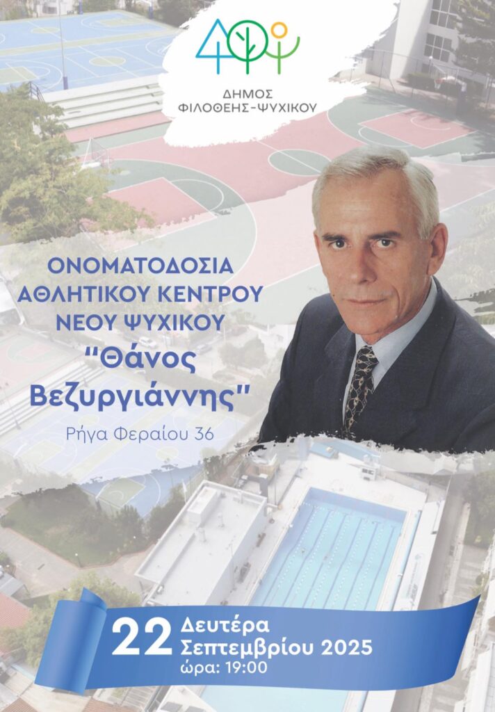 Σε ένδειξη βαθιάς ευγνωμοσύνης και διαρκούς τιμής στον αείμνηστο Δήμαρχο Θάνο Βεζυργιάννη, ο Δήμος Φιλοθέης – Ψυχικού προχωρά στην επίσημη Ονοματοδοσία του Αθλητικού Κέντρου Νέου Ψυχικού στο όνομά του. Η […]