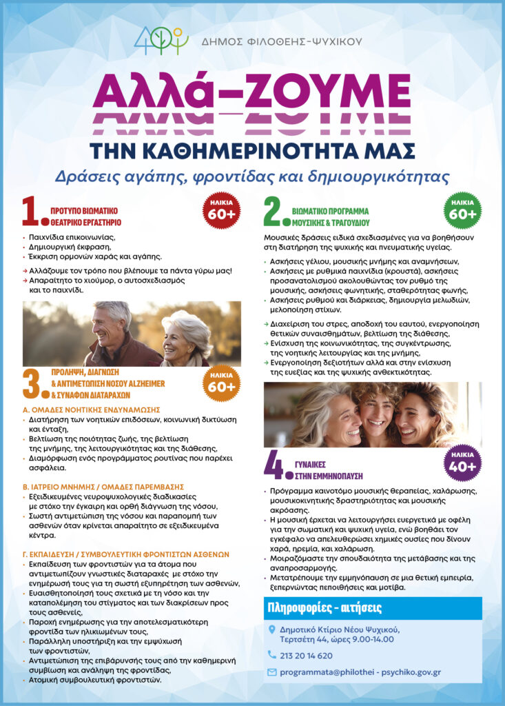 Ο Δήμος Φιλοθέης-Ψυχικού με το πρόγραμμα «Αλλά-ΖΟΥΜΕ την Καθημερινότητά μας», διοργανώνει μια σειρά στοχευμένων δράσεων για την ενίσχυση της ψυχικής υγείας, της ποιότητας ζωής και της ενεργούς συμμετοχής των κατοίκων. […]