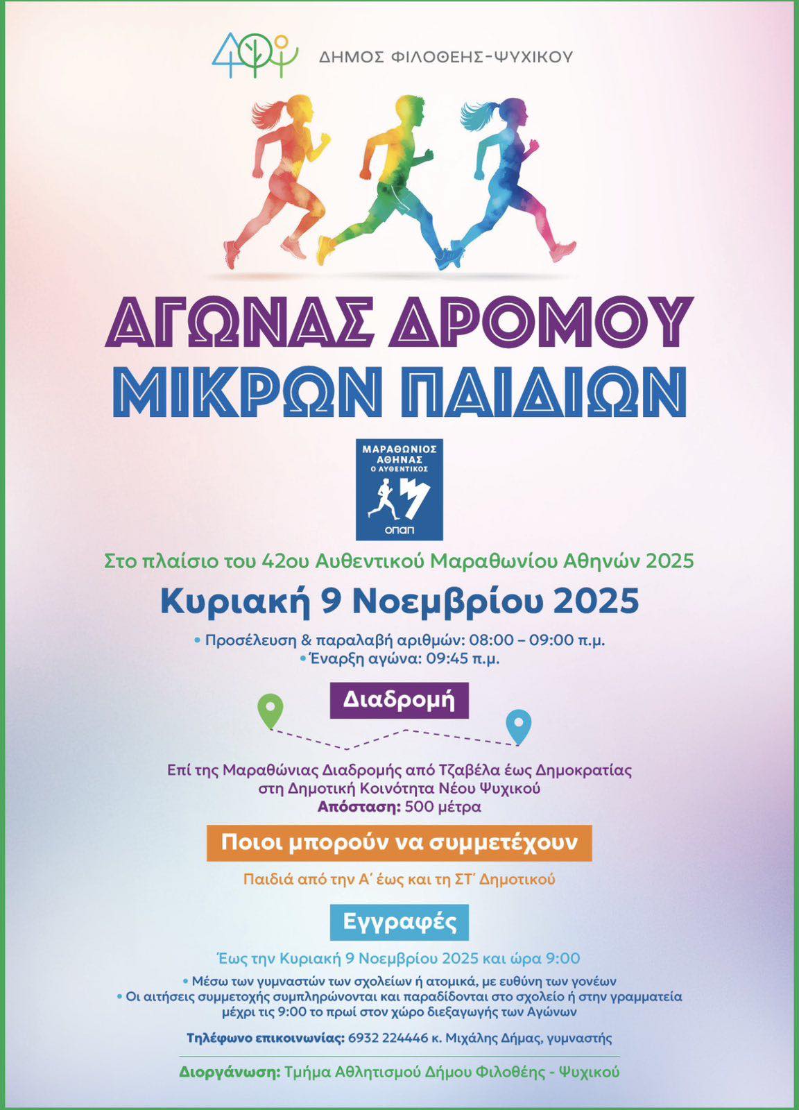 Ελάτε να στηρίξουμε τους μικρούς μας δρομείς σε έναν αγώνα χαράς και συμμετοχής με στόχο να γνωρίσουν τα παιδιά μας τη μαγεία του αθλητισμού και του ευ αγωνίζεσθαι.