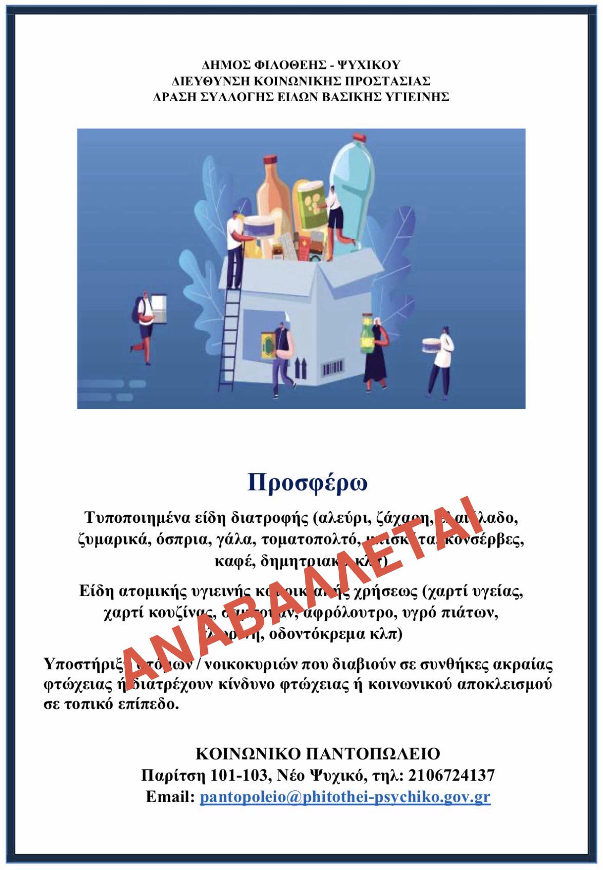 Λόγω των δυσμενών καιρικών συνθηκών που αναμένεται να επικρατήσουν και αύριο στην περιοχή μας, η προγραμματισμένη δράση ενίσχυσης του Κοινωνικού Παντοπωλείου του Δήμου μας (2-3 Απριλίου) έξω από το σουπερμάρκετ Σκλαβενίτης, αναβάλλεται.