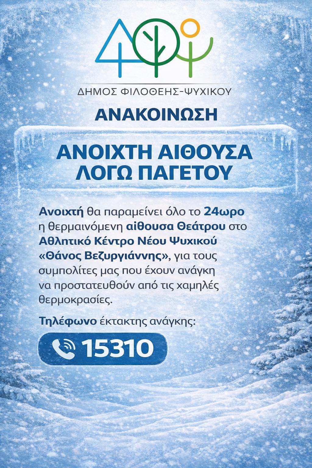 Ανοικτή για το κοινό η θερμαινόμενη Αίθουσα Θεάτρου στο Αθλητικό Κέντρο Ν. Ψυχικού «Θάνος Βεζυργιάννης»