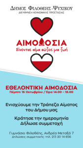 Εθελοντική Αιμοδοσία Δήμου Φιλοθέης Ψυχικού – Παρασκευή 15 Νοεμβρίου
