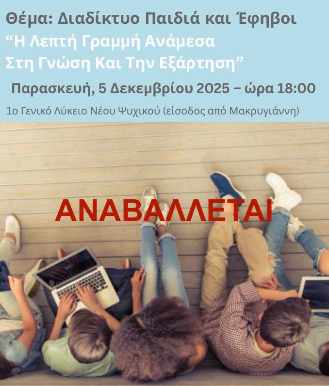 Αναβολή της εκδήλωσης Διαδίκτυο, Παιδιά και Έφηβοι – “Η Λεπτή Γραμμή Ανάμεσα στη Γνώση και την Εξάρτηση”