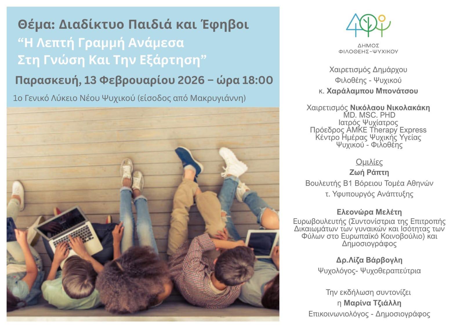 Ο Δήμος Φιλοθέης-Ψυχικού διοργανώνει την Παρασκευή 13 Φεβρουαρίου μια ιδιαίτερα σημαντική εκδήλωση με θέμα «Διαδίκτυο, Παιδιά και Έφηβοι – Η Λεπτή Γραμμή Ανάμεσα στη Γνώση και την Εξάρτηση». Στόχος είναι η ενημέρωση και η ανάδειξη των προκλήσεων που αντιμετωπίζουν οι νέοι στον ψηφιακό κόσμο, τα όρια ανάμεσα στη δημιουργική χρήση του διαδικτύου και στους κινδύνους της υπερβολικής εξάρτησης.