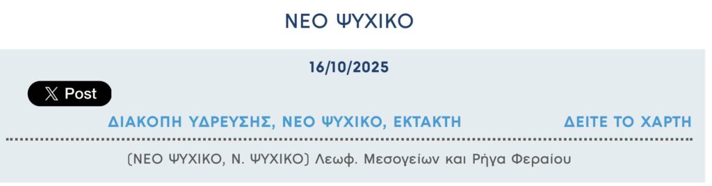 Πρόκειται για έκτακτη διακοπή, που οφείλεται σε εργασίες αποκατάστασης βλάβης στη συμβολή της Λ. Μεσογείων με την Ρήγα Φεραίου.