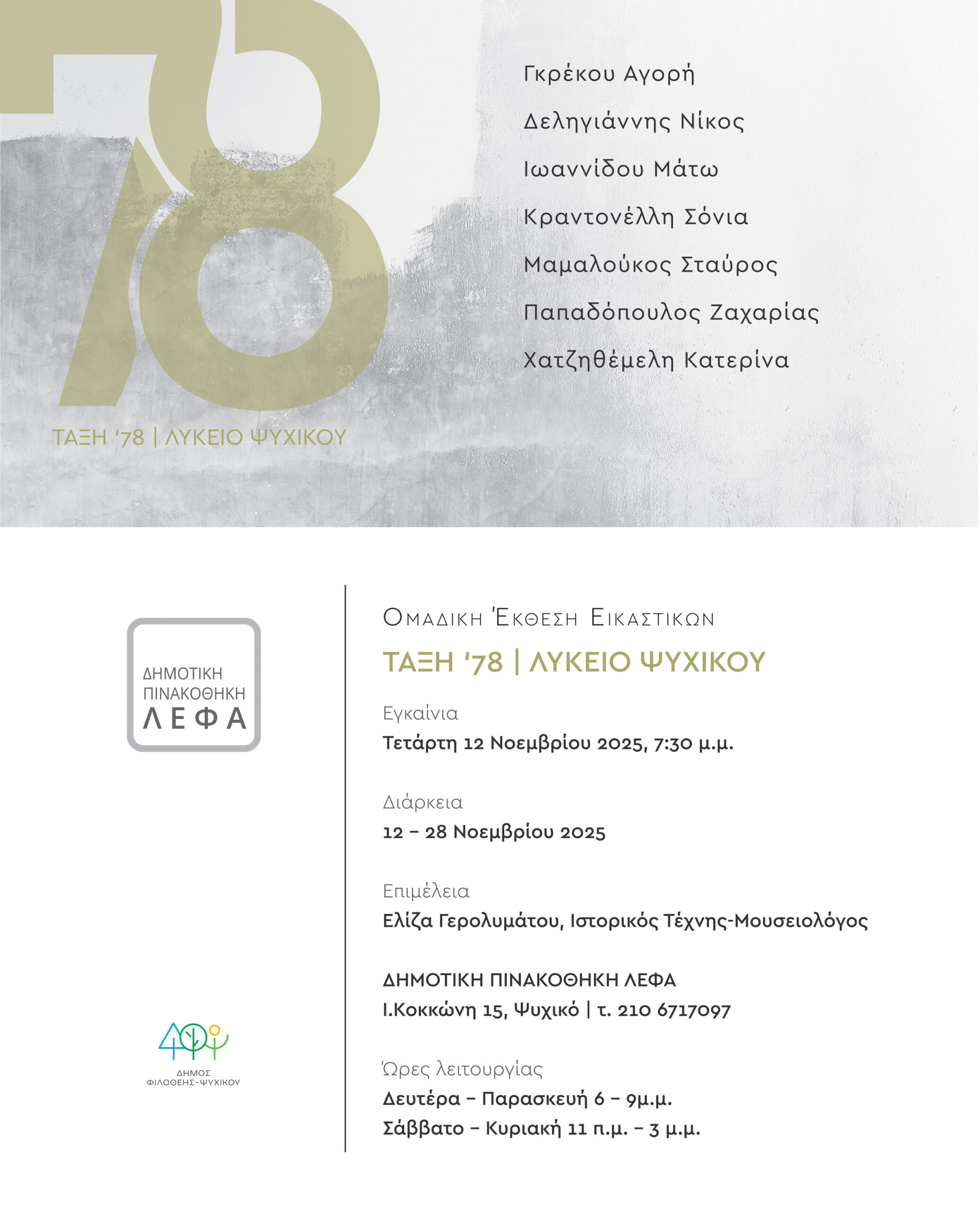 Η Δημοτική Πινακοθήκη Λέφα στο Ψυχικό υποδέχεται τον Νοέμβριο στις αίθουσες της την Ομαδική Έκθεση των Αποφοίτων Εικαστικών του Λυκείου Ψυχικού της Τάξης του 1978.
