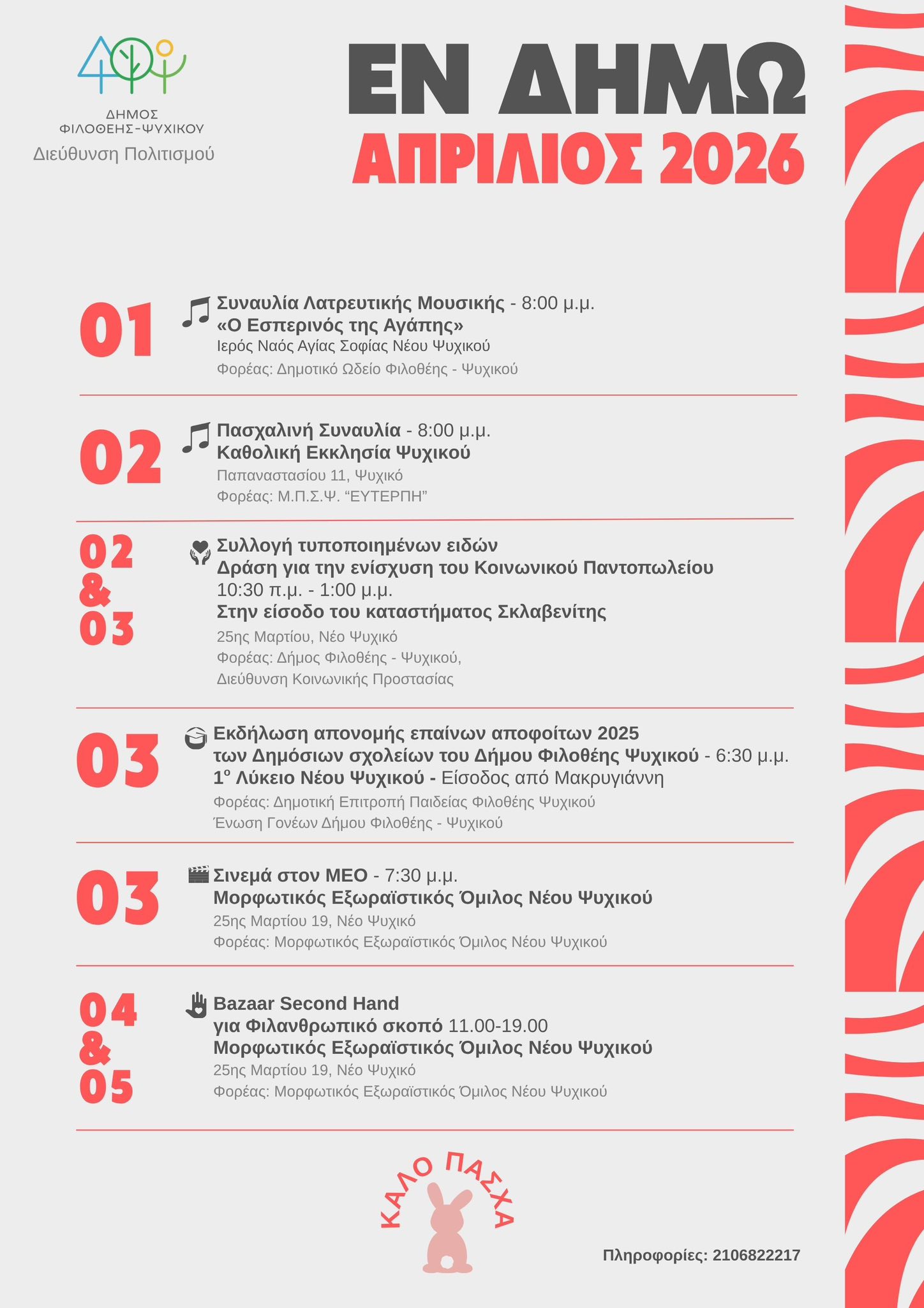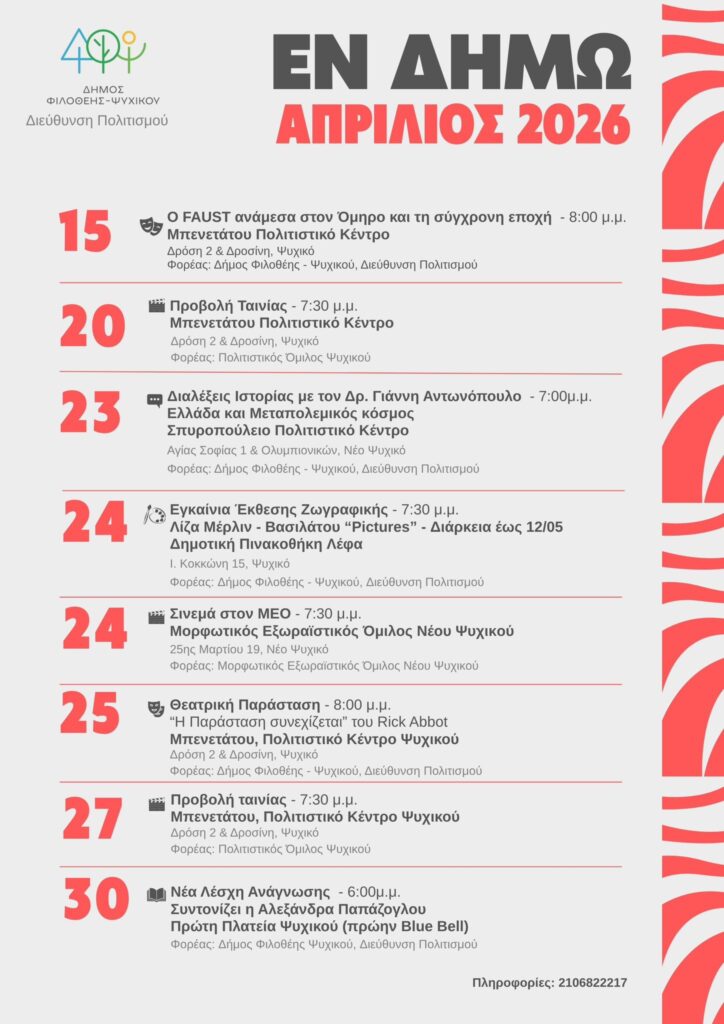 Τον Απρίλιο ο Δήμος Φιλοθέης – Ψυχικού φιλοξενεί ένα πλούσιο πρόγραμμα πολιτιστικών εκδηλώσεων και δράσεων στις οποίες περιλαμβάνονται: