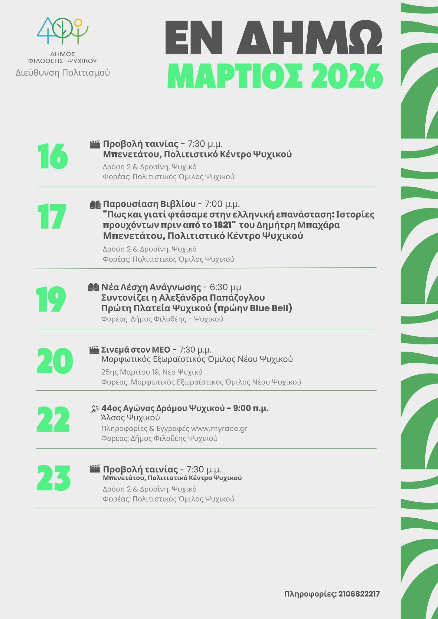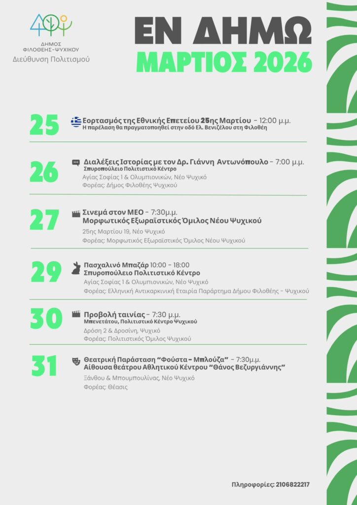 Από τις 16 έως τις 31 Μαρτίου, ο Δήμος Φιλοθέης – Ψυχικού φιλοξενεί ένα πλούσιο πρόγραμμα εκδηλώσεων και δράσεων στις οποίες περιλαμβάνονται: