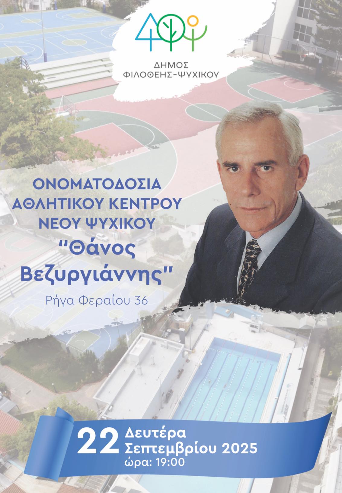 Σε ένδειξη βαθιάς ευγνωμοσύνης και διαρκούς τιμής στον αείμνηστο Δήμαρχο Θάνο Βεζυργιάννη, ο Δήμος Φιλοθέης – Ψυχικού προχωρά στην επίσημη Ονοματοδοσία του Αθλητικού Κέντρου Νέου Ψυχικού στο όνομά του.
